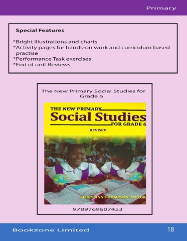 Primary Special Features *Bright illustrations and charts *Activity pages for hands-on work and curriculum based practise *Performance Task exercises *End of unit Reviews The New Primary Social Studies for Grade 6 9789769607453 Bookzone Limited 18