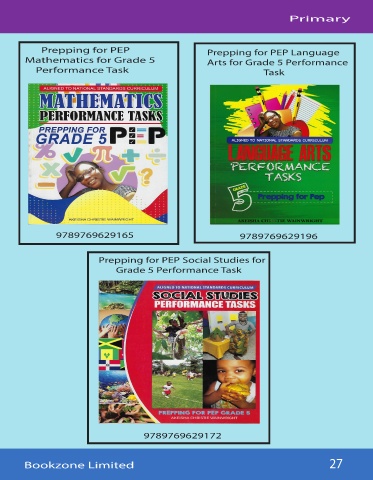 Primary Prepping for PEP Prepping for PEP Language Mathematics for Grade 5 Arts for Grade 5 Performance Performance Task Task 9789769629165 9789769629196 Prepping for PEP Social Studies for Grade 5 Performance Task 9789769629172 Bookzone Limited 27