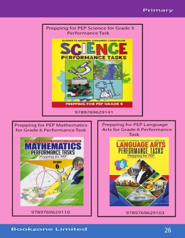 Primary Prepping for PEP Science for Grade 5 Performance Task 9789769629141 Prepping for PEP Mathematics Prepping for PEP Language for Grade 6 Performance Task Arts for Grade 6 Performance Task 9789769629110 9789769629103 Bookzone Limited 26